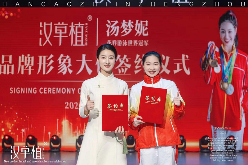 庆典活动上:汉草植品牌创始人任任和全国运动会花样游泳自由组合冠军汤梦妮进行了形象代言签约仪式,冠军品质汉草植,品牌实力非常雄厚。